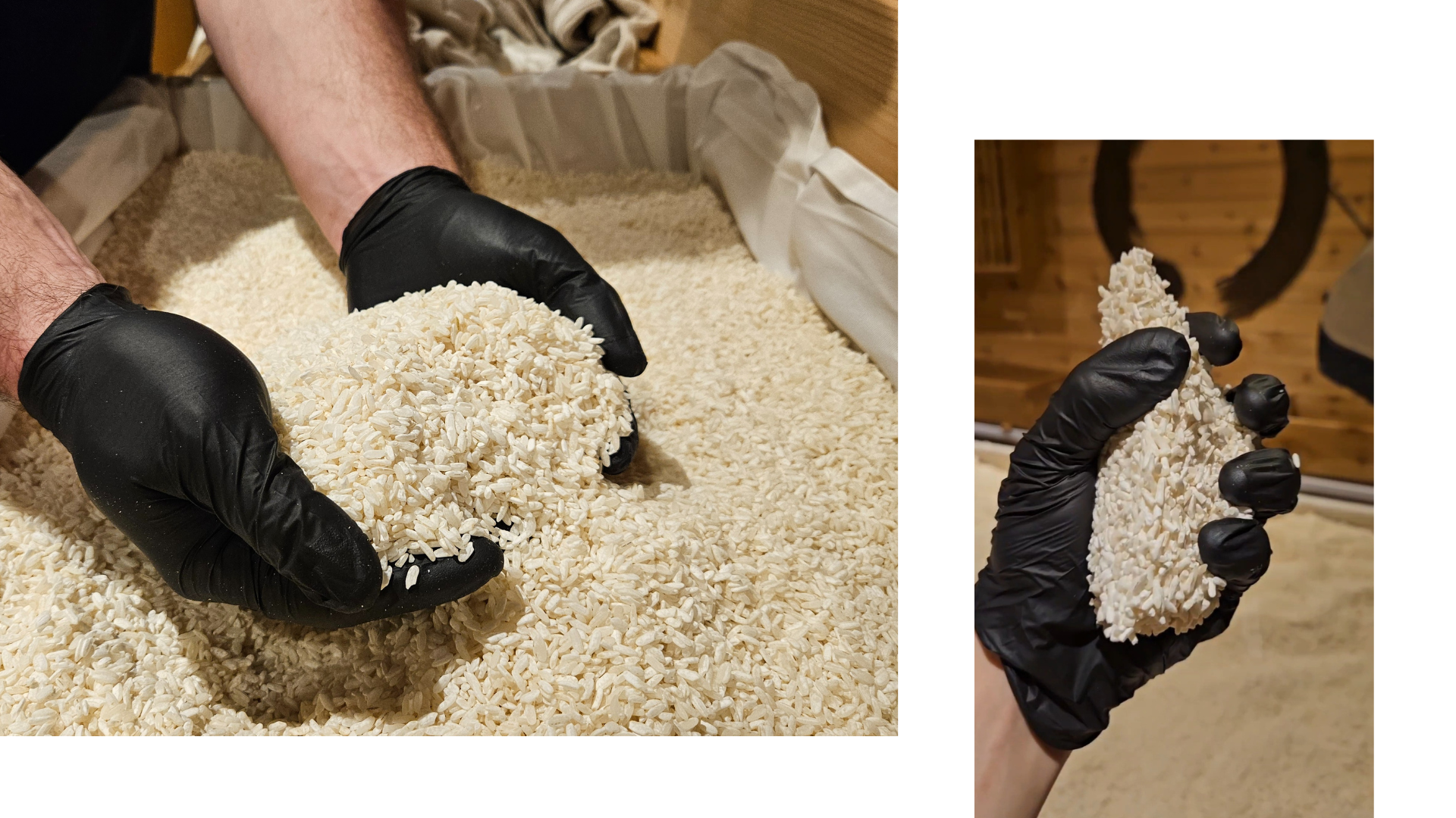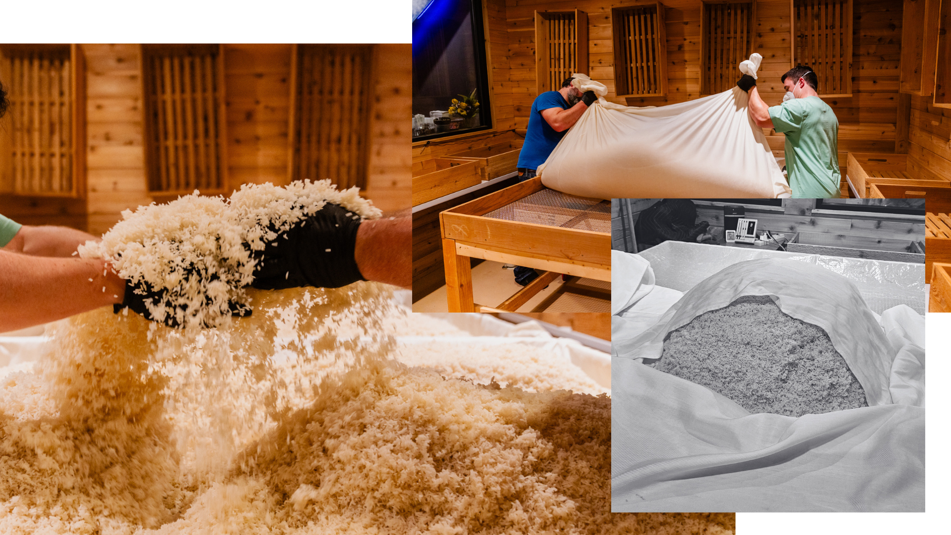 The koji inoculated rice is repeatedly kneaded to evenly distribute the koji spores. The rice is then mounded into a large pile and covered with a blanket to encourage spore growth.